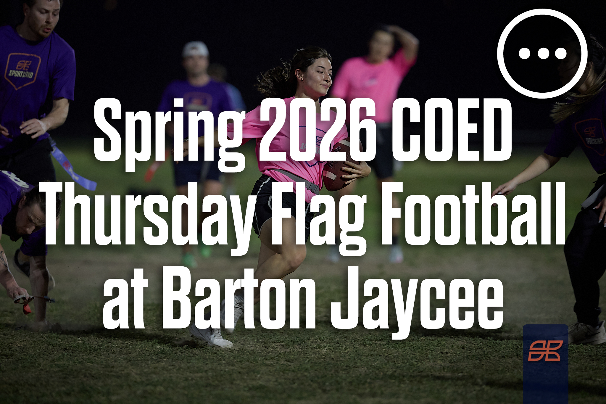 Flag football is an 8 on 8 non-contact league. All players must have SPORTSKIND provided shirts as their uniforms and will wear the provided flags around their waist. The objective is to score more points than your opponent in a format similar to college football overtime rules.TOURNAMENT FORMAT